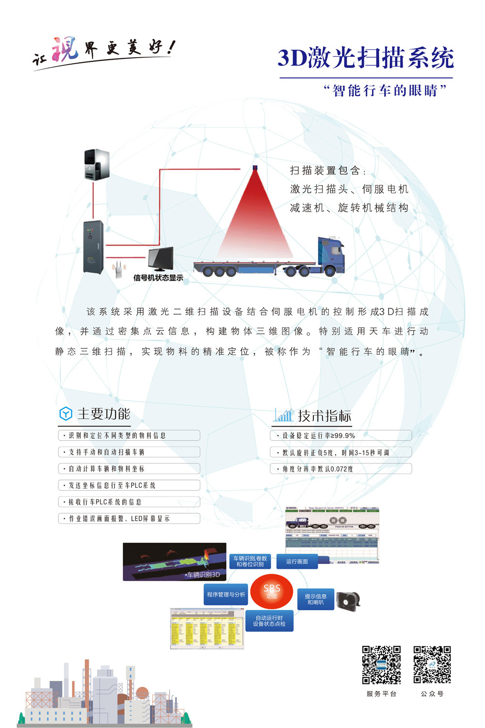 3D激光(guāng)掃描識别系統是(shì)天車(chē)的(de)視(↔shì)覺系統,用(yòng)于闆卷、鋼筋、高(gāo)線盤圓、廢鋼、集裝箱碼頭、煤場(chǎng)、礦場(chǎng)、物(wù)流庫、裝≠配車(chē)間(jiān)等裝卸物(wù)料、裝配安裝工(gōng)件(jiàn)進行(xíng)立體(tǐ)掃描,實現(xiàn)物(wù)料的(de)精準定位。